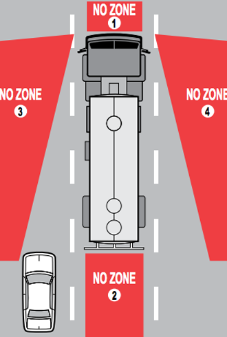 Không nên chạy song song ở hai bên của xe tải hoặc xe buýt. Từ vị trí ngồi của tài xế họ có những điểm mù lớn - không thể quan sát từ cabin ở cả hai bên thân xe. Nếu bạn không nhìn thấy khuôn mặt của người lái xe trên kính chiếu hậu của họ, tài xế xe tải/xe buýt không thể nhìn thấy bạn. Nếu họ phải thay đổi làn xe vì lý do nào đó, ví dụ có vật cản trên đường phía trước, bạn có thể gặp rắc rối nếu chạy song song ở vị trí điểm mù từ cabin xe tải/xe buýt.
