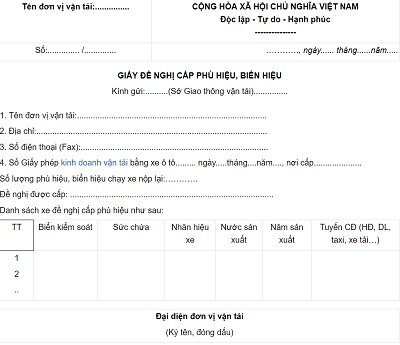 Mẫu đơn xin cấp phù hiệu xe tải bạn có thể tham khảo mẫu sau đây (Ban hành kèm theo Thông tư số: 63/2014/TT-BGTVT ngày 07 tháng 11 năm 2014 của Bộ trưởng Bộ Giao thông vận tải):